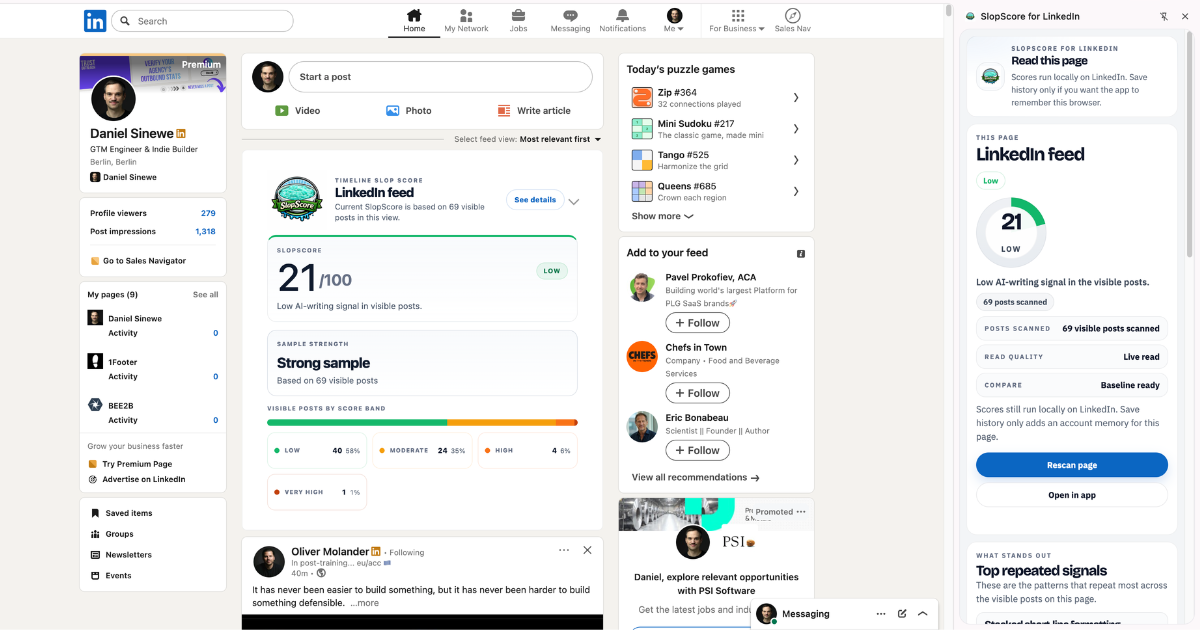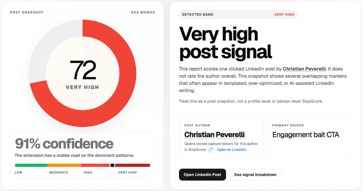 Sloppa loppa slop slop, you sloppenheimers! The LinkedIn feed is a radioactive wasteland of AI motivational sludge! Alright listen, listen for a second, okay? LinkedIn is completely overrun with AI motivational sludge right now. I’m talking hooks, engagement bait, “five lessons about leadership,” the whole inspirational content-industrial complex. It’s everywhere. So I ran the numbers. And the numbers were bad. Real bad. So I built a machine: slopscore.in It scans the LinkedIn feed directly. It analyzes the posts you’re looking at. AI signals, engagement bait density, formulaic hook structures, the whole linguistic ecosystem. Then it calculates the SlopScore. You paste the post in, the machine runs the analysis, and boom. Instant slop diagnosis. AI signals. Engagement bait. Corporate storytelling radiation. Install the extension. Run the scan. Let the machine judge the slop.
