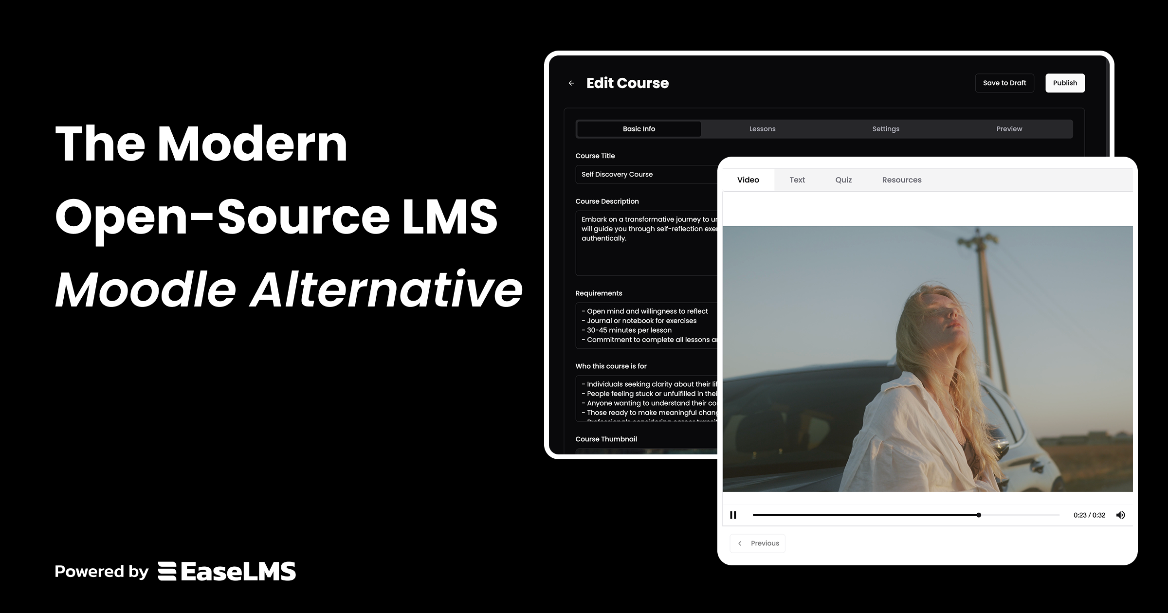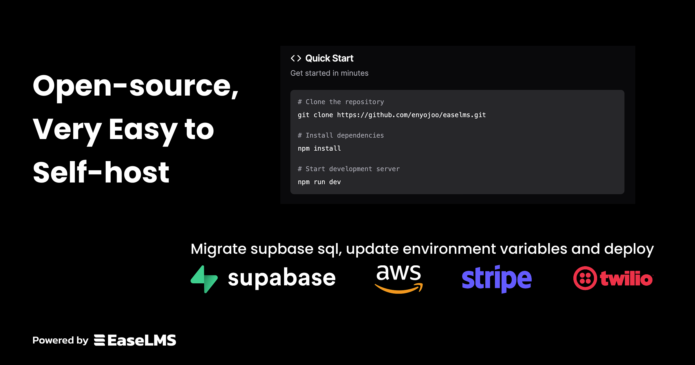 EaseLMS is an easy-to-install open-source Learning Management System for building and selling online courses: video lessons, quizzes, progress, certificates, analytics, and payments, with a separate marketing site and deep branding/SEO controls — self-hostable or available as a hosted service.