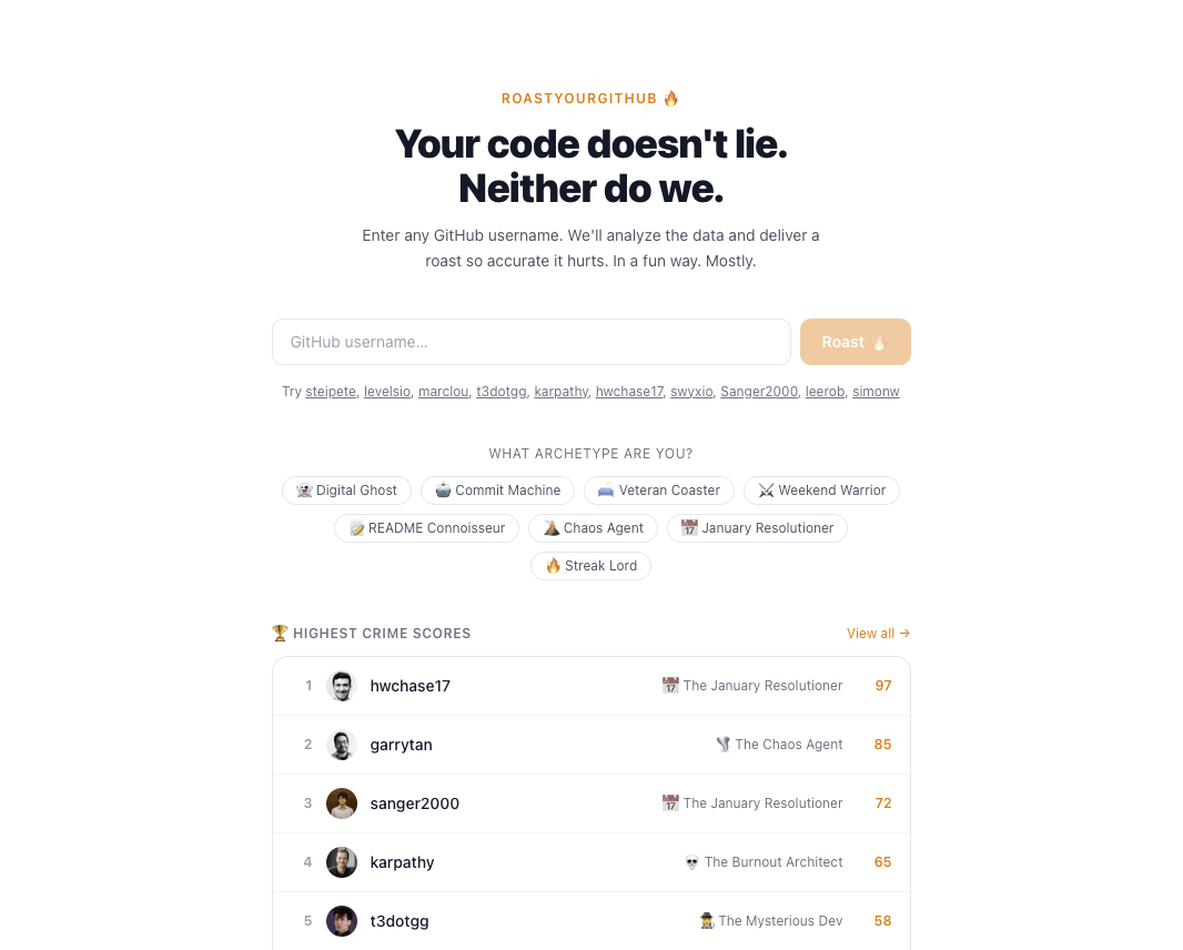Enter a GitHub username and get a savage, data-driven roast of your contribution history. 100% free. 0% mercy.